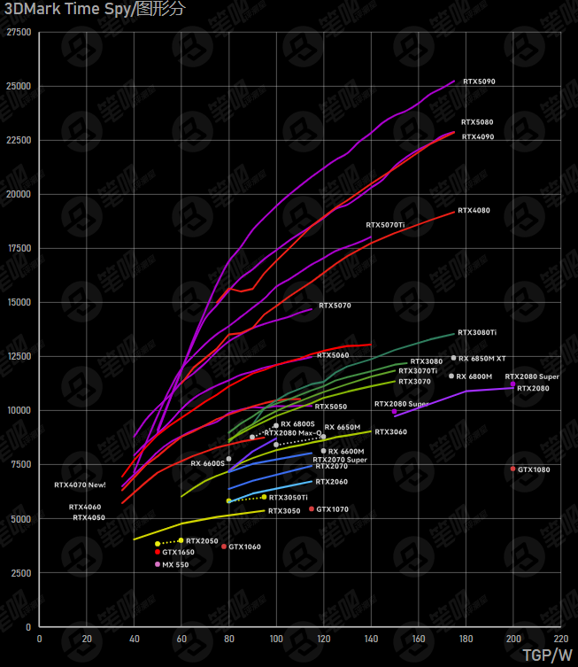 RTX50 及 RTX40 系列主流独立显卡性能对比,以 Time Spy 为例综上,我们一般建议同学你选购搭载 RTX5070Ti 及以下显卡配置的产品,当然,如果同学你履丝曳缟,选择搭载 RTX5080 甚至 RTX5090 的笔记本产品也并非不可。只是,在这种预算条件下,组装一台搭载 RTX5070Ti、RX9070(XT) 或更高显卡配置的台式电脑会明显更为合适。