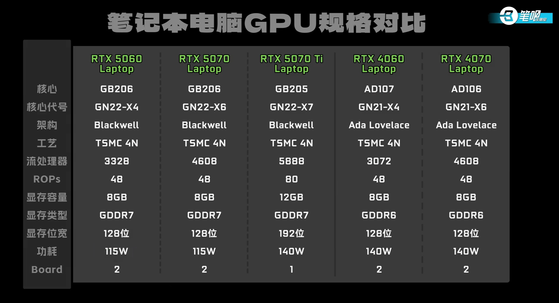 从而另一角度来看,RTX50 系列最大的亮点恐怕是其基于 TSMC 5nm 工艺带来的惊人能效比:RTX5070 仅需要不到 100W 的功耗就能超越 RTX3080 在 180W 时的性能,堪称外星科技!毫无疑问,极高的能效比对于那些关注机身三围的性能本用户是一个巨大利好,因为这使得这些用户仍可以在充电设备功率受限的情况下拥有相当的图形性能。所以同学你完全可以期待市场上那些具有轻薄设计的性能本的表现,比如天选的 Air 系列。
