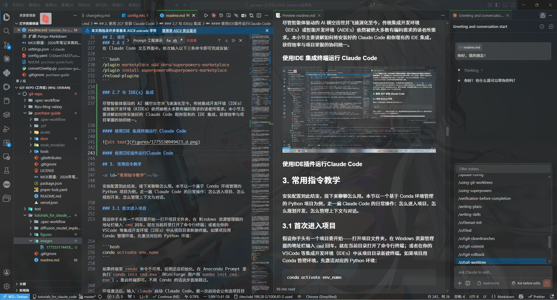 新版教程在保留安装配置流程的基础上,新增两章初版中被忽略的内容:常用指令教学和Prompt 工程演示。前者介绍Claude Code原生指令与Superpowers补充指令的使用方法,帮助读者快速上手;后者通过diffusion_model_implementations这一模块开发案例,系统讲解如何通过Prompt工程最大化AI编程产出质量,进而拓展Claude Code的能力边界。