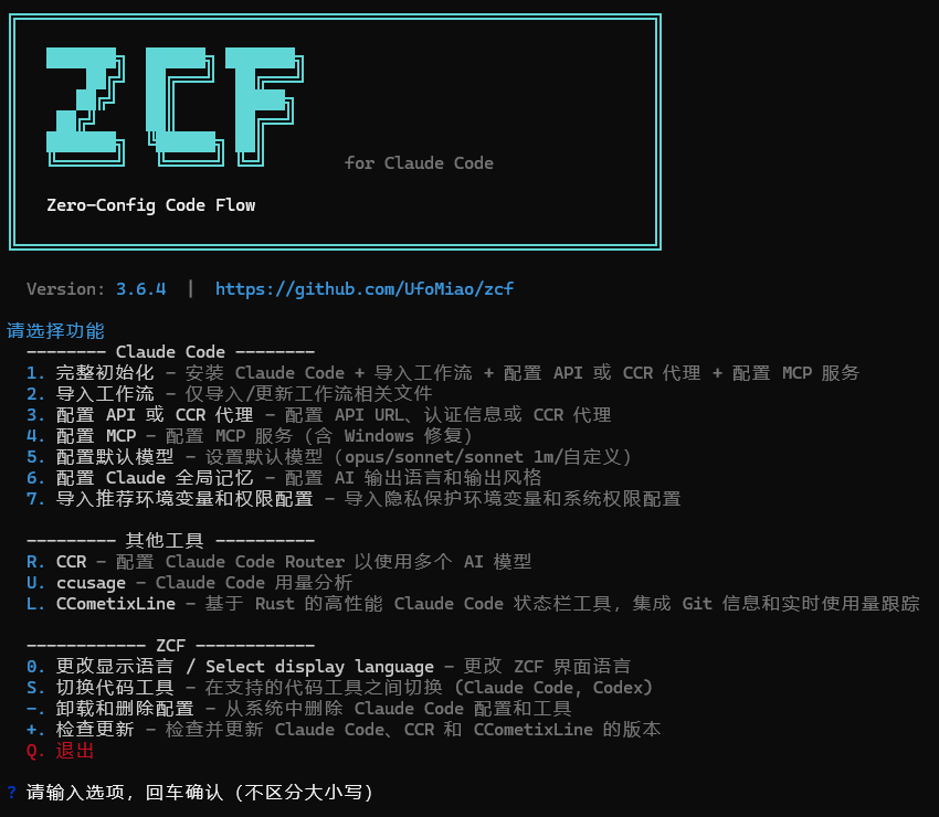 根据ZCF的项目说明,需要使用以下指令安装ZCF: