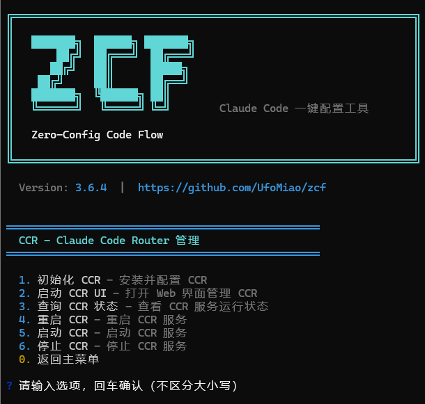 CCR管理页面在CCR管理页面输入选项“2”并回车打开CCR UI,注意首次打开CCR UI时需要使用登录密钥“sk-zcf-x-ccr”。